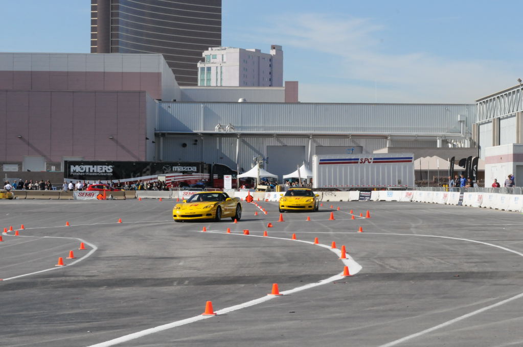 Description: Bob Bondurant instructors take SEMA participants around SEMA MotorTrend Proving Ground in C6 Corvettes Photos from SEMA Convention 2009